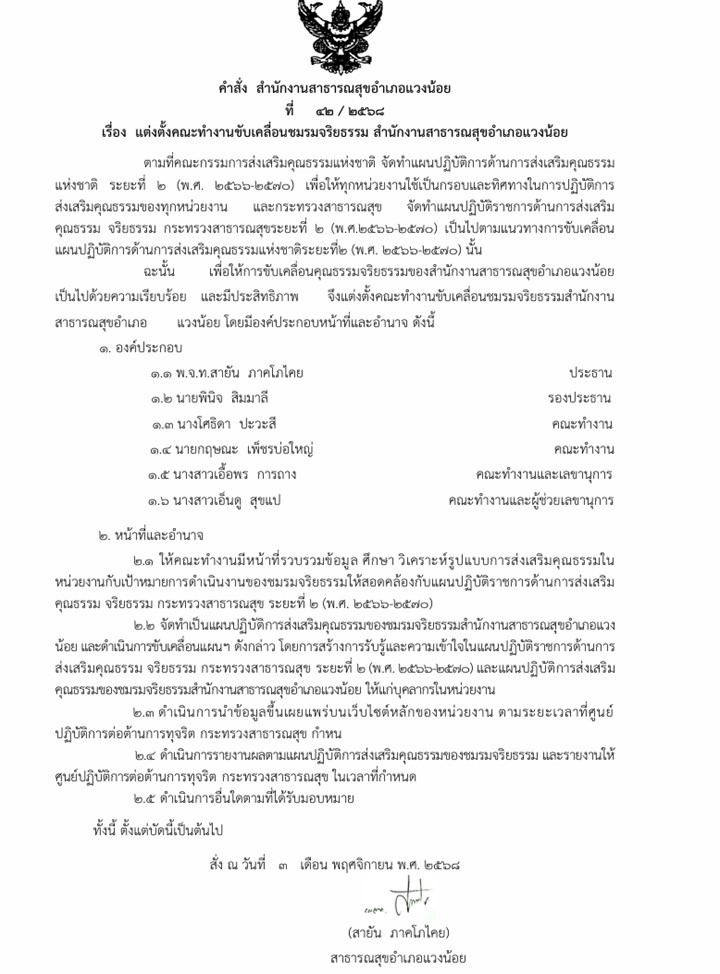 คำสั่งแต่งตั้งคณะกรรมการชมรมคุณธรรมจริยธรรมสำนักงานสาธารณสุขอำเภอแวงน้อย ปี 2569